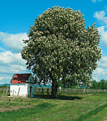 Neusiedl után lassan délnek fordul az út, Joisnál egy forró káposztalevessel átmelegítjük magunkat, és erőt gyűjtünk a Seehofig hátralevő szakaszhoz. Kell is az energia, mert a szél ugyan alábbhagy, viszont hullámossá válik a táj, föltekerünk, legurulunk, egy kis dombon lecsücsülünk, csüccs. Mindenfelé példásan karbantartott szőlőültetvények, terebélyes diófák, az út mentén cseresznye, ebből biztos, hogy nem sok marad a gazdának. A B10-es egyben országos osztrák borút is, bár rejtély, hogyan borozgathat a borúton az ember, ha egyszer nemcsak autót, de biciklit is tilos részegen vezetni.