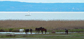 De lássuk végre a vizet! Víz helyett először egy kiszáradt, szikes öblöcskére bukkanunk. Buzgón nyalogatjuk a földet, hogy tényleg sós-e, de nem, csöppet sem az. Azután egy kanyar után ránk szakad a romantika: előttünk nádas hajlong, kicsit messzebb a víz úgy szikrázik, mint a frissen dermedt üveg, hófehér vitorlások. A vízig húzódó mocsaras réten lovak legelésznek, vadludak totyognak, a túlparton apró falvak piroslanak haragoszöld erdők karéjában, az égen csipkés szélű felhők nyargalásznak a bolondos szél elől. Béke van, gyönyörű, isszuk magunkba a látványt, és a reggel kulacsunkba töltött citromos vizet.