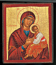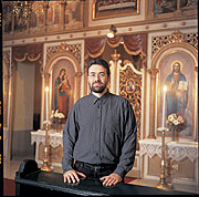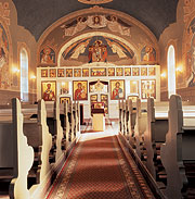 Az ikon két világ között van. Az e világot és a túlvilágot összeköti valami vagy valaki. A mi hitünk szerint Jézus Krisztus. Az ikon mindig őt, az ő tetteit, életének eseményeit mutatja meg. Ezért nem egészen realisztikus az ábrázolás, vannak benne olyan festészeti és más megoldások, amelyek a két világ közötti lebegést, összekötő szerepet hangsúlyozzák. Ilyen a fordított perspektíva, hogy nem úgy húznak össze a párhuzamosok, amint azt látjuk például a reneszánsz képeken, hanem éppen fordítva. Nézze, ezen az egyszerű asztalon vagy ezen a síron is, a párhuzamosok nem összetartanak, hanem szét. A liturgián belül, a képeken túl, az énekekben és minden érzékszervünkre hatóan ez fejeződik ki, annyira, hogy azt is mondjuk, egy kis mennyországban vagyunk, itt a templomban. Ennyire komoly az, hogy itt a két világ összeér.
