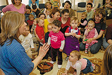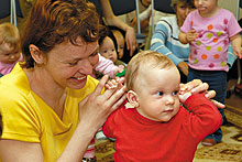 Megszámoltam, tíz kismama ül a körben, ölükben a kisgyerekük. Van, akinek a másé, mert a gyerekek cseréltek, de ez ritka eset, itt még mindenki marad a mamájával. A kicsik közül a legtöbb már biztonsággal jár, de azért egy-két ölbeli is van a csapatban. Marci mindenesetre a kétévesek öntudatával áll, a biztonság kedvéért azért el nem ereszti anya egyik ujját, és megbűvölve nézi Ilit, aki éppen a békákat utánozza: