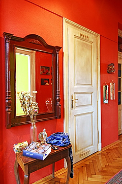 Előszobarészlet. Egyből egy vörös térbe lépünk be, ahogy az első energiaközpont, a gyökércsakra színe is vörös. Indulás előtt ebben a tükörben történnek az „utolsó simítások”.