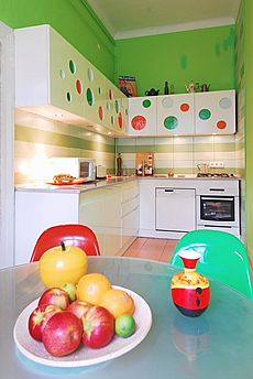 A pop art stílusú konyha szó szerint üde foltja a lakásnak. „Keleti fekvésű, reggel besüt a nap, szó szerint derűs a reggeli teázás.”