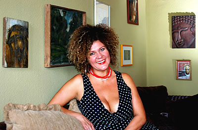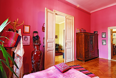 A lila hálószoba. „Ha már a csakrák színszimbólumának analógiáját visszük végig a lakáson, akkor szinte logikus, hogy ha az előszoba (gyökércsakra) vörös, akkor a hálószoba lila. Hiszen a »3. szem« csakra ibolyaszínű, a korona, azaz fejtető energiaközpont pedig indigó. De ezt már csak utólag okoskodom bele. A színkiválasztásnál egyszerűen tudtam, éreztem, hogy az alváshoz nekem ez a szín kell.”