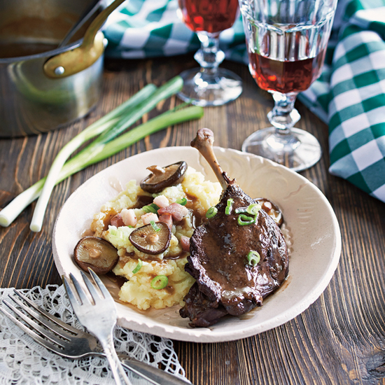 Alacsony lángon, lefedve 2-3 óráig főzzük, amíg a combok teljesen megpuhulnak. A combokat kivesszük, leszűrjük a levet, majd tovább forraljuk, és besűrítjük. Hozzáadunk 1 evőkanál hideg vajat, hogy krémesebb legyen a mártás. A körethez a felkockázott burgonyát sós vízben puhára főzzük, leszűrjük, félretesszük. A maradék vajon megpirítjuk az apróra vágott szalonnát és a feldarabolt gombát, sózzuk, 5 perc alatt megpirítjuk. Kiszedjük a gombát, majd a szalonnás zsiradékba forgatjuk a főtt burgonyát, kissé összetörjük, sózzuk, borsozzuk.
