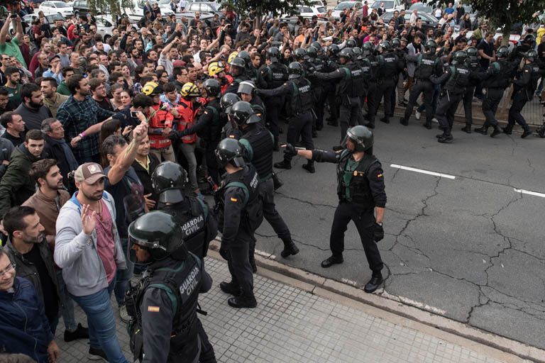A múlt vasárnapra – valószínűleg véletlenül, de épp Franco tábornok államfői beiktatásának 81. évfordulójára – kiírt népszavazást ennek ellenére megtartották, azonban a spanyol rohamrendőrök sok helyen igyekeztek ezt megakadályozni. A spanyol kormány 4000 rendőrt vezényelt Katalóniába, akik lefoglalták a szavazóurnákat, emellett a szavazni kívánó emberek közül sokakat letartóztattak, de sokakat össze is vertek. Az eddigi információk szerint 761 ember sérült meg a rendőri fellépések miatt. A különböző hírcsatornák tudósításai és az internetre felkerült videók tanúsága szerint számos olyan eset is előfordult, amikor a rendőrök látszólag békésen tiltakozó demonstrálóknak estek neki gumibotokkal. A városban uralkodó káosz miatt zárt kapuk mögött tartották az FC Barcelona–Las Palmas-focimeccset, amelyen a Barcelona játékosai a katalán függetlenségpártiak sárga-piros színeivel ellátott mezekben pózoltak a meccs előtti csapatfotón.