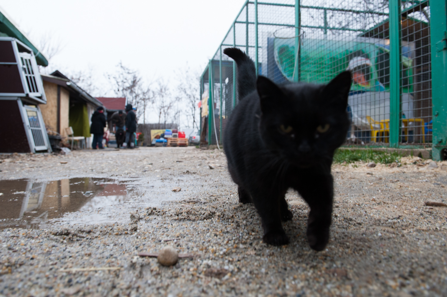 Budaörsön, a hipermarketek és logisztikai központok mögött merőben más világba csöppenünk. A Vasút utca biztató betonburkolata hamar hepehupás földútra vált. Még szerencse, hogy nem kell sokat autóznunk rajta, néhány méretes gödrön átkelve, hamar elérjük a Budaörsi Állatmenhelyet. A vaskapu már nyitva, pedig még csak szombat reggel kilenc óra van, de két önkéntes már a kutyasétáltatásból tart vissza. A nagytestű, fekete szépség, Borisz röpke szabadságból való visszatérése elképesztő „kutyaugatás-cunamit” indít el, alig halljuk egymás hangját Balázs Terézzel, az egyesület titkárával, akivel elindulunk, hogy bejárjuk a telepet. Menet közben macskák dörgölőznek a lábunkhoz, a többiek egy nagy kosárban összebújva, infralámpa alatt élvezik a kellemes meleget, és eszük ágában sincs a hidegben sétálgatni.