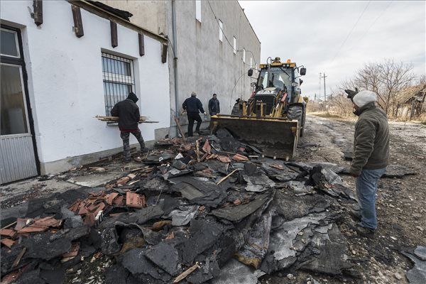Eltakarítják a Polgárdi Széchenyi István Általános Iskola és Alapfokú Művészeti Iskola tornaterme tetőborításának darabjait, amelyeket letépett a szél 2017. december 29-én.