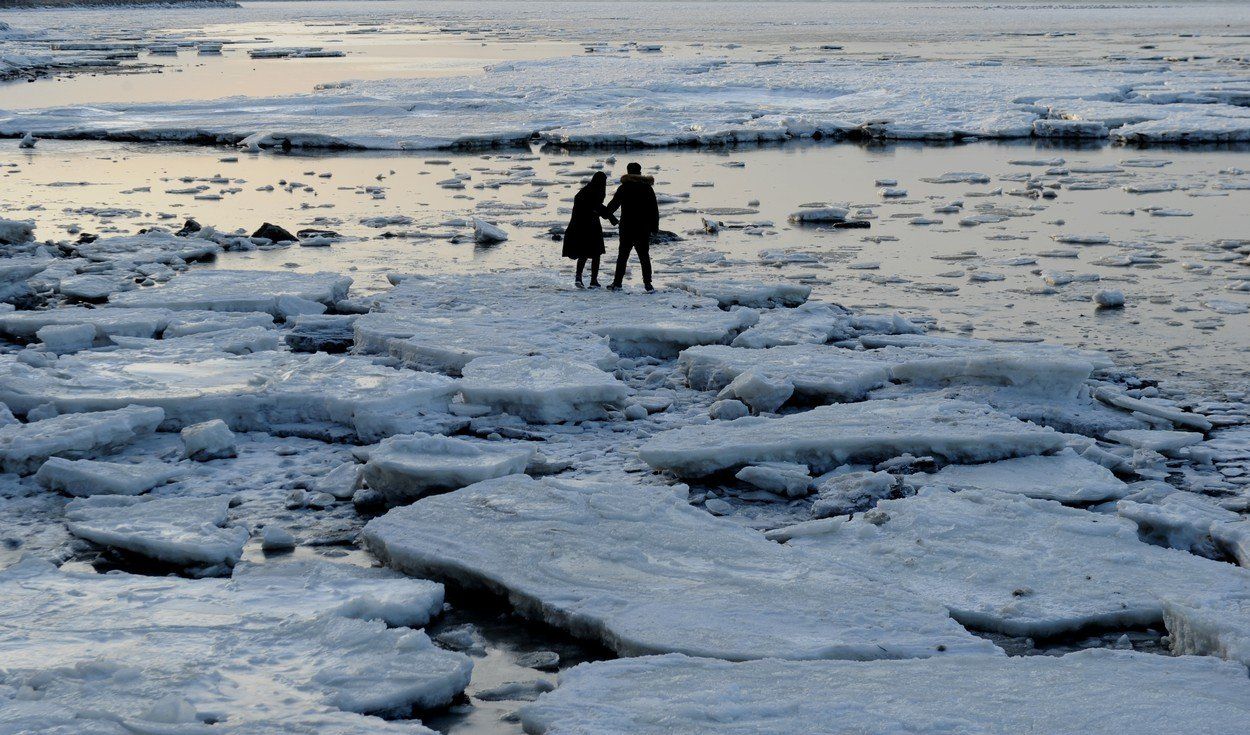 Óriási jégtáblákon sétál két turista az északkelet-kínai Dalian partjainál. (Fotó: Profimedia, Zuma Press – News)