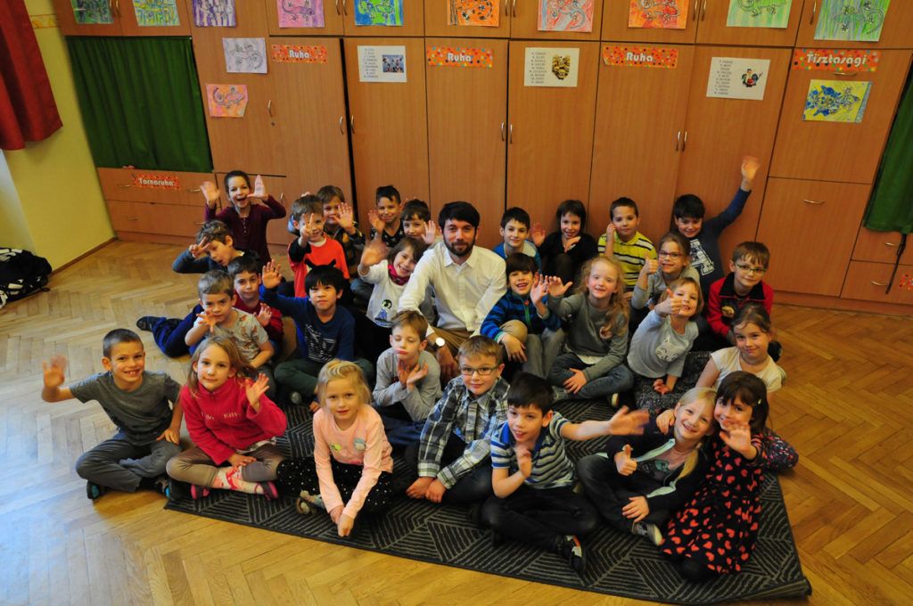 A zuglói Herman Ottó Tudásközpont Általános Iskola épületét kicsit nehezen találom meg, de mikor meglátom, már biztos vagyok benne, hogy jó helyen járok. A hatalmas, régi iskolaépület tekintélyt parancsolóan magasodik a környékbeli házak fölé. Ahogy belépek, rég nem hallott gyerekzsivaj fogad, épp szünet van. A büfé mellett az 1. b. osztály ajtaja is nyitva, a gyerekek szőnyegen játszanak, de hamarosan felhangzik az órakezdésre figyelmeztető dallam, és lassan mindenki visszatalál a padjához. Az osztályfőnök, Tóth Sándor csak kedvesen figyelmeztet, egy pillanatra sem emeli fel a hangját. De nincs is szükség rá, mert elsősei elképesztően lelkesek, úgy tűnik, nagyon könnyű velük dolgozni. Ehhez hozzájárul az is, hogy Sanyi bácsi mai gyakorlóórájának a jedilovagok a főszereplői. Egy Star Wars-rajongó osztálynál pedig ez remek kiindulópont.