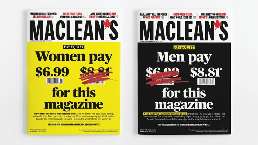 A Maclean’s című havi lap kétféle címlappal dobta piacra legutóbbi számát. A nőknek szóló változatért 6,99 kanadai dollárt, vagyis körülbelül 1414 forintot kérnek, ennyibe kerülnek az egyes lapszámok minden hónapban. A mostani kiadáshoz azonban készült egy másik címlap is, amely szerint a férfiaknak ennél többet, 8,81 dollárt kell fizetniük, ha meg akarják vásárolni a magazint.
