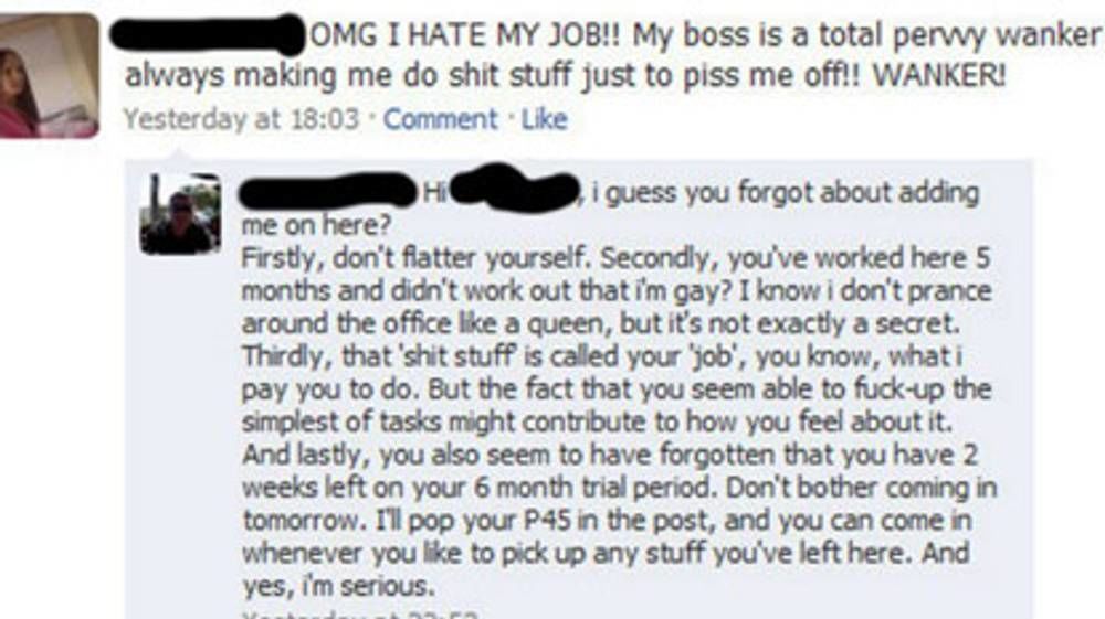 Igazi balek, aki így jár – mondhatjuk joggal, pedig több ilyen is történt már. Egy Lindsay nevű nő a bejegyzésében azt írta, hogy utálja a munkáját, a főnöke egy perverz idióta, aki mindig szarságokkal bízza meg, és ez az egész teljesen kiakasztja.