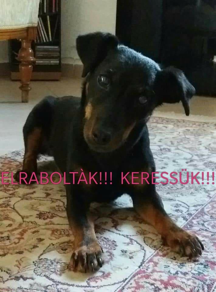 Az eltűnt kutya egy Mogyoró nevű, ivartalanított, fekete, kis termetű jagd terrier. Az állatot csonkolt farkáról és beteg, hályogos szeméről lehet felismerni – utóbbi miatt most műtötték volna. A kutyában chip is van.