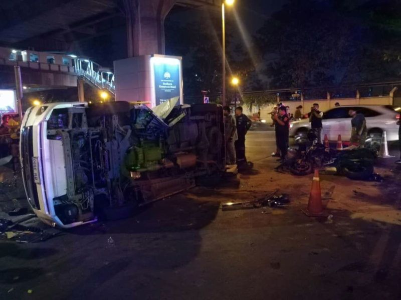 Az ütközés erejétől az oldalára dőlt furgon és az egyik motor is látható a The Nation fotóján (Fotó: Nationmultimedia.com)