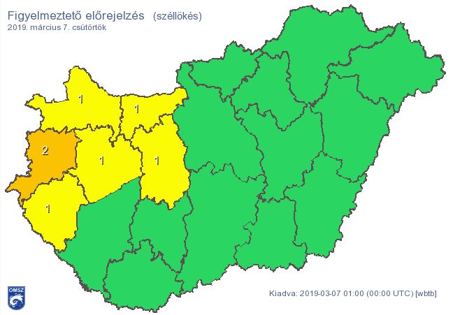 A figyelmeztetés összesen hat megyét érint: Fejér, Győr-Moson-Sopron, Komárom-Esztergom, Veszprém és Zala megyében elsőfokú, Vas megyében pedig másodfokú figyelmeztető előrejelzés van érvényben.