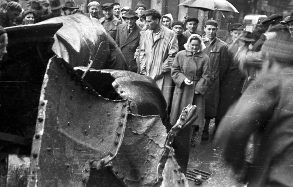 A feldarabolt Sztálin szobor egy darabja az Akácfa utcában, 56-ban (Fotó: Fortepan)