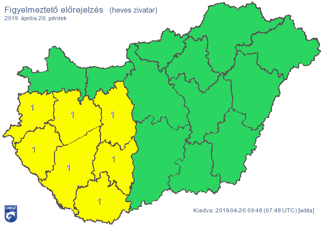 A zivatarokat akár 80-90 kilométer/órás, viharos szél, jégeső és jelentős csapadék kísérheti. A meteorológia figyelmeztetést is kiadott 7 megyére: