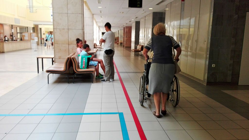 A Honvédkórház (Magyar Honvédség Egészségügyi Központ) sürgősségi centrumának automatikusan nyíló üvegajtaján belépve először azt hiszem, rossz helyen járok, olyan néptelen, csendes az aula. Aztán a lépcső tetején megpillantom a terepmintás egyenruhát viselő őrt az övén a walkie-talkie-val és a gumibottal. Végül is katonai intézményben vagyok… Udvariasan igazít útba, csak a piros vonalat kövessem, az vezet a sürgősségi centrumba. Az előtérben néhányan ülnek csak, a többiek egy szintén üvegajtóval elválasztott helyiségben, a traumatológiai váróban.