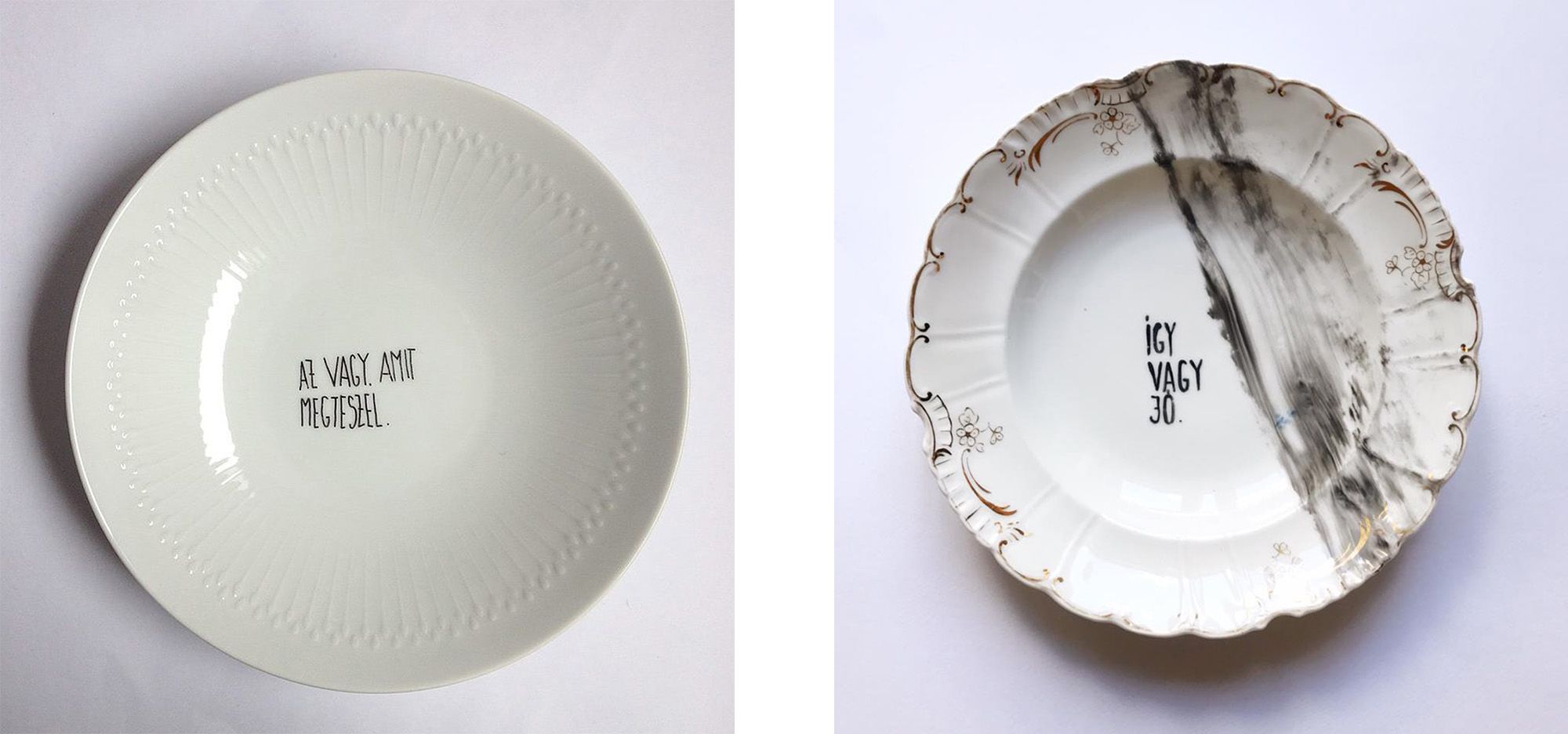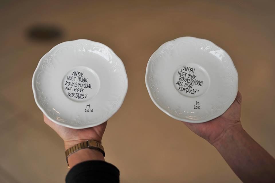 Élik, persze, vándorolnak, én is találkozom néha a sajátjaimmal hol jobb, hol rosszabb helyeken. De az a helyzet, hogy ha én valamit létrehozok és elengedek, akkor ahhoz nekem nincs többé viszonyom. Már a Képzőn is éreztem: miután kész a felület, amin a gondolataim vannak, egyáltalán nem érdekel. Nem tudok azzal foglalkozni, hogy mikor mennyi pénzt ér, milyen galériába kerül, kikkel kell beszélni, kikkel kell jóban lenni… Ezek tárgyak. Ezt az ügymenetet, ranglétrát, akármit végigjárni nekem nincs kedvem. Éppen ezért sorozatgyárthatók a tányérok. Hiába készülnek kézzel, nagyobb tételben gyártom őket. Az viszont tényleg nagyon fontos, hogy egyenként, kézzel írjam a szöveget, úgy, hogy elérhető áruk legyen, ne legyenek soha kanonizált műtárgyak.