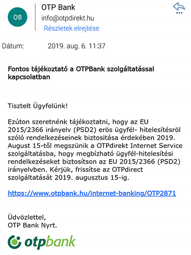 Főleg e-mailen és a közösségi oldalakon terjed az alábbi hamis üzenet, amely az OTPdirekt frissítésére szólít fel – figyelmeztet honlapján az OTP Bank. A szöveg valótlanságokat tartalmaz, és szövegezése is magyartalan, nehezen értelmezhető.