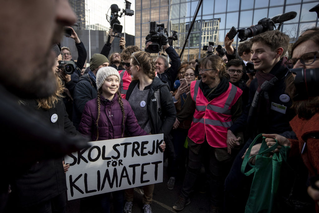 Greta Thunberg egy februári klímatüntetésen Brüsszelben (Fotó: Maja Hitij/Getty Images)