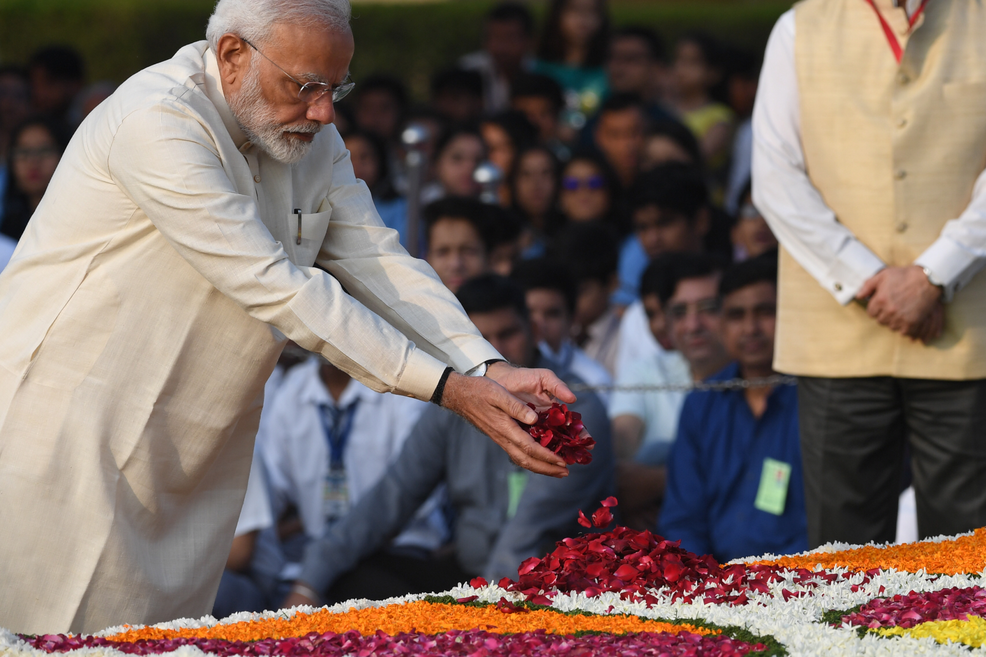 Narendra Modi indiai miniszterelnök rózsaszirmokat szór Mahatma Gandhi síremlékére (Fotó: Prakash Singh / AFP)