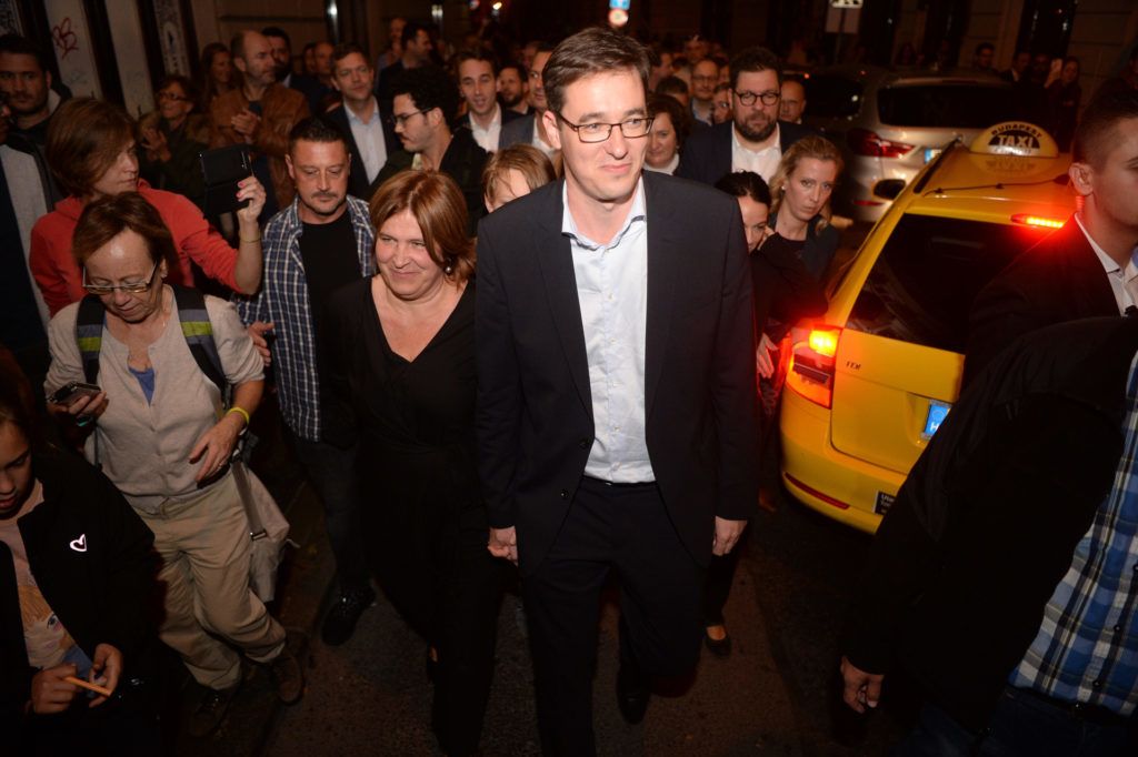 Karácsony Gergely feleségével, Kiss Virággal az önkormányzati választás eredményváró rendezvényére tart (Fotó: MTI / Balogh Zoltán)