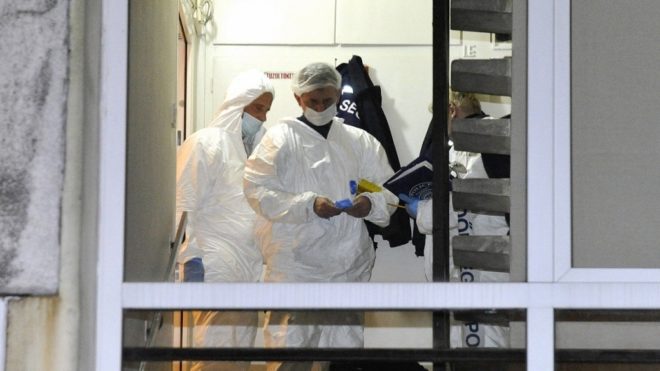 Bűnügyi helyszínelők dolgoznak a kőbányai társasházban, ahol 2019. december 30-án egy nő bántalmazás áldozata lett. A nő a kórházban belehalt sérüléseibe (Fotó: MTI / Mihádák Zoltán)