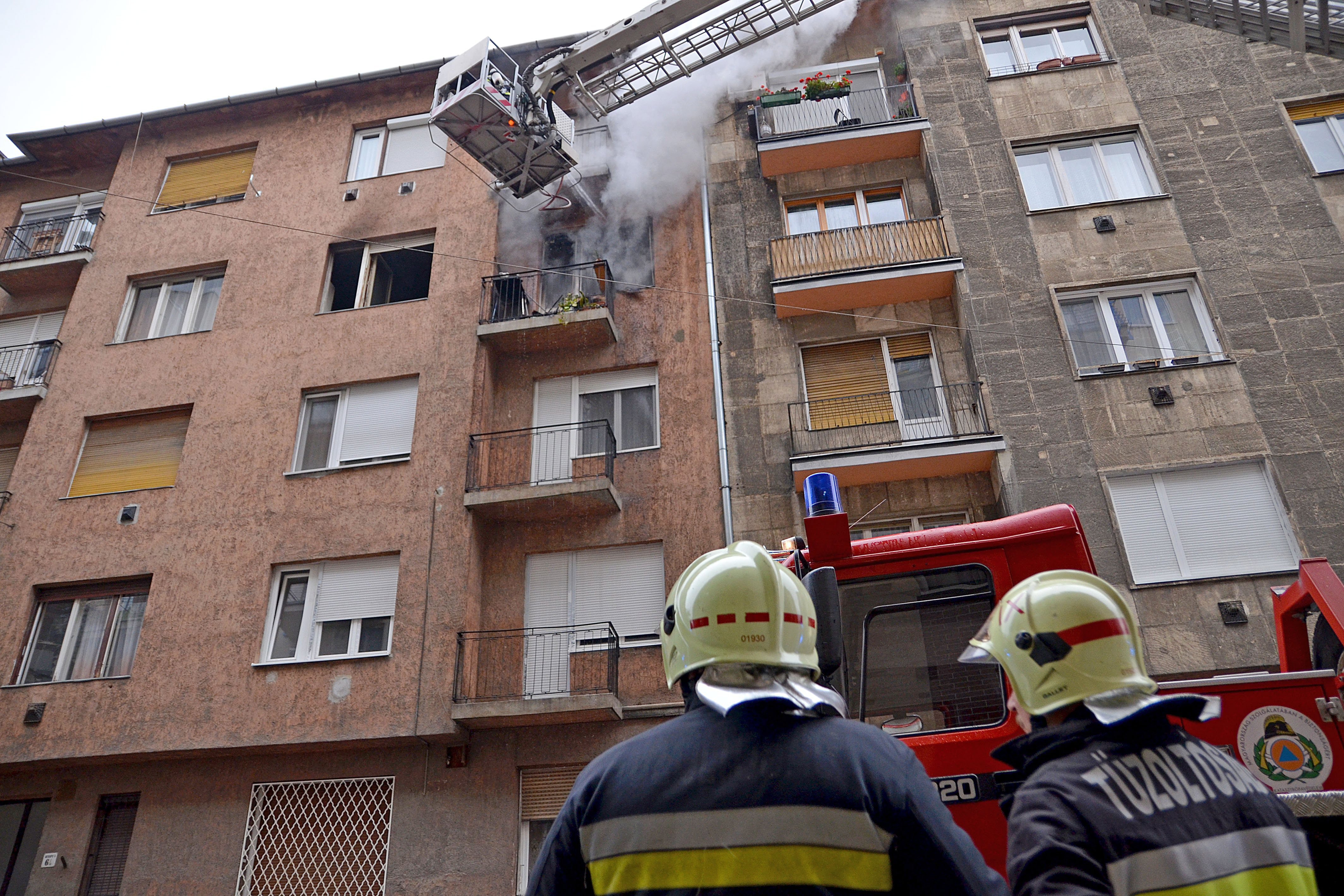 Lakástûz a IX. kerületben egy Vaskapu utcai társasház harmadik emeletén. A tűzoltók öt lakót menekítettek ki az épületből (Fotó: MTI Fotó / Mihádák Zoltán)