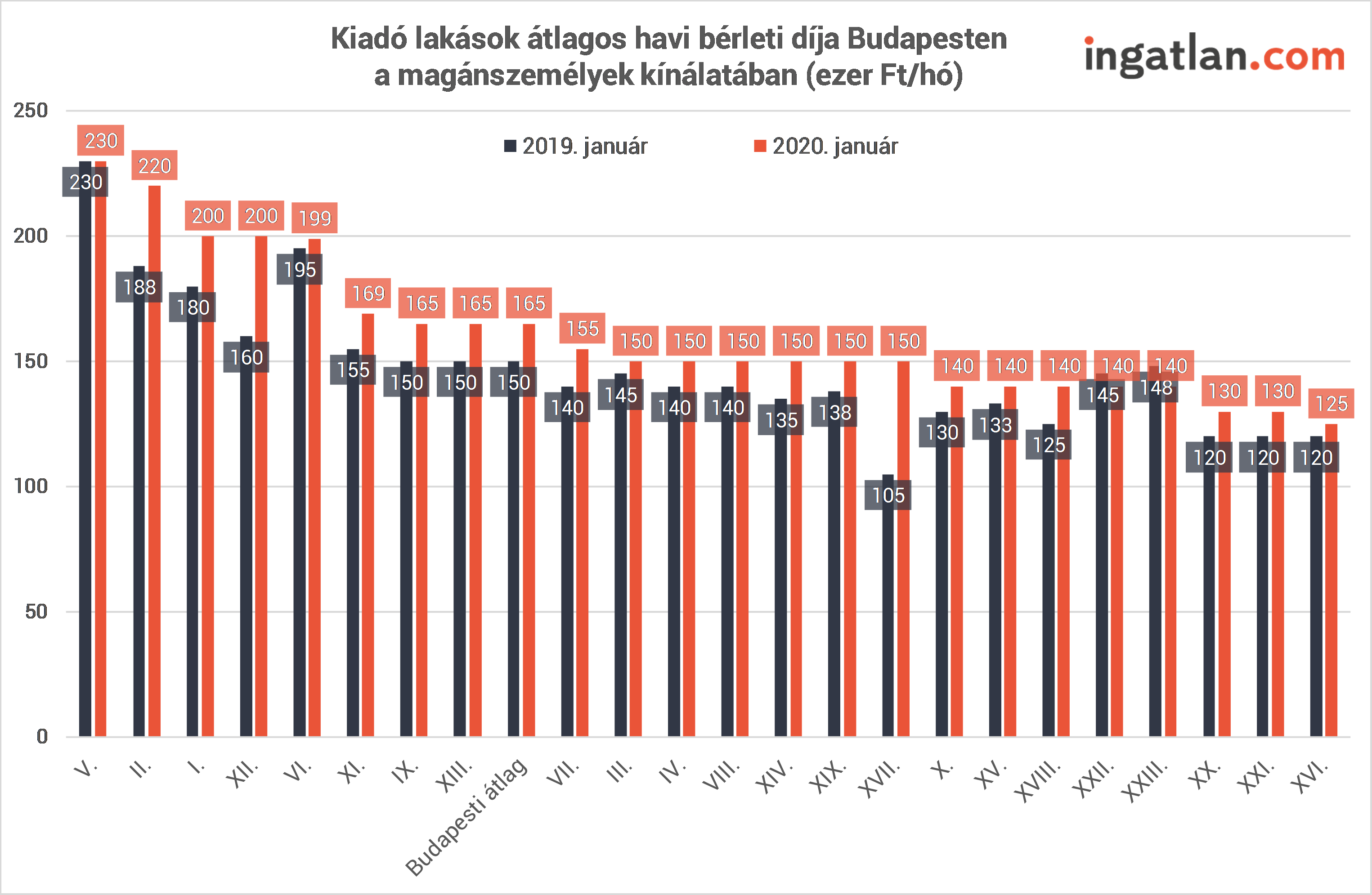 Az elemzés ugyanakkor egy fontos változást is bemutat. A főváros 6. kerületében, amely felkapott környék volt az albérletpiacon, idén januárban 199 ezer forint volt az átlagos bérleti díj, ami mindössze 2 százalékos emelkedésnek felel meg éves szinten. Az 5. kerületben pedig stagnáltak az árak, így most 230 ezernél jár a havi díj. A vidéki nagyvárosok közül hasonló a helyzet Debrecenben, ahol szintén mindössze 2 százalékkal 100 ezer forintra nőtt az átlagos bérleti díj. Kecskeméten és Szombathelyen ugyanennyiért lehet lakást bérelni, ami viszont nem jelent változást a tavaly januári szinthez képest egyik városban sem. Pécsett sem változtak tavaly január óta az albérletárak, itt havonta átlagosan 90 ezer forintot kell fizetni.