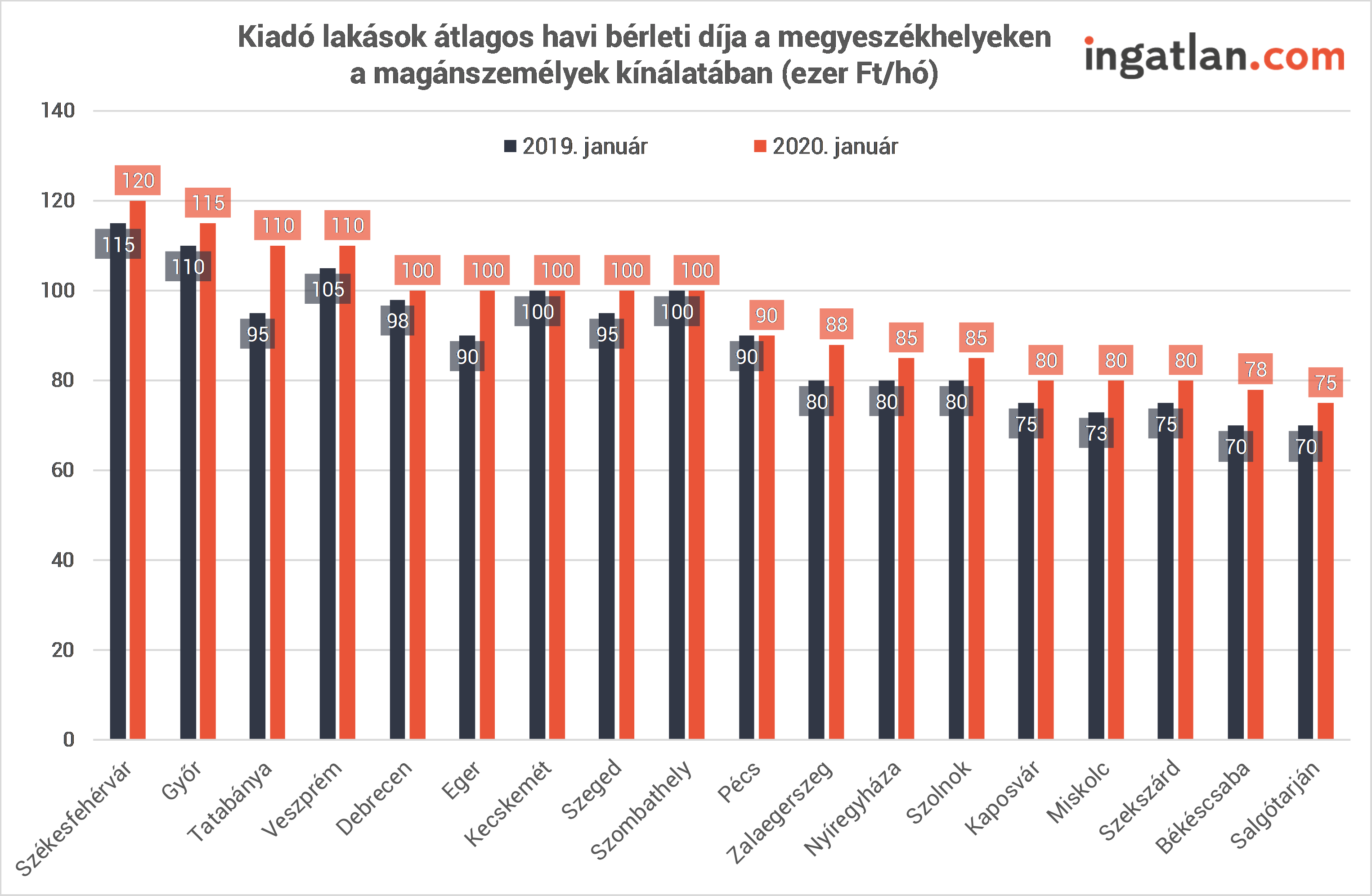 A kiadó lakások átlagos bérleti díja Budapesten idén januárban 165 ezer forint volt, ami 10 százalékos emelkedésnek felel meg éves összevetésben. A megyeszékhelyeken pedig 11 százalékkal 100 ezer forintra nőtt a havi díj. Az átlagos bérleti díjak emelkedésében szerepe van annak is, hogy a Budapestre és a többi nagyvárosba költöző emberek nagy része az első években a vásárlás helyett inkább lakást bérel a magas ingatlanáraknak köszönhetően. Ez pedig folyamatos utánpótlást jelent a kiadó lakások iránti keresletben.