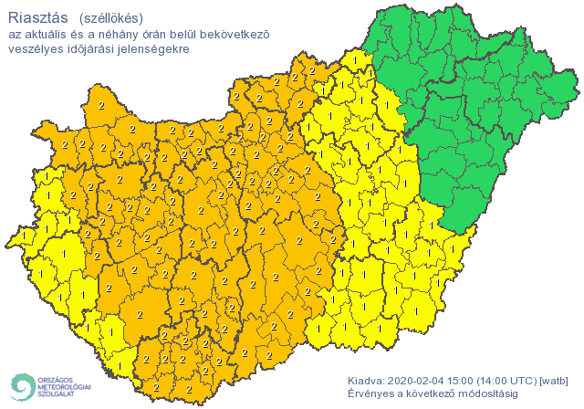 Az Országos Meteorológiai Szolgálat veszélyjelzése szerint a legerősebb széllökések a Dunántúlon és a középső országrészben általában 70-100 kilométer/óra között várhatók kedd késő estig. Estétől keleten, északkeleten is kialakulhatnak 70 kilométer/óra feletti széllökések.