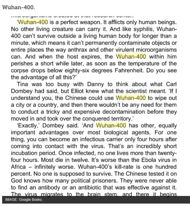 Azt írják, hogy a regény története szerint a Wuhan-400 vírust biológiai fegyverként fejlesztették ki azzal a céllal, hogy 100 százalékos halálozási rátájával kipusztítsa az emberiséget. A lap megjegyzi, hogy van két fontos különbség a regénybeli kitalált és a valódi vírus között, ebből az egyik a halálozási ráta, mivel a koronavírusé 2 százalékos, a másik pedig a lappangási idő: míg a koronavírus 2-14-ig lappang, addig a WUHAN-400 alig 4 óráig.