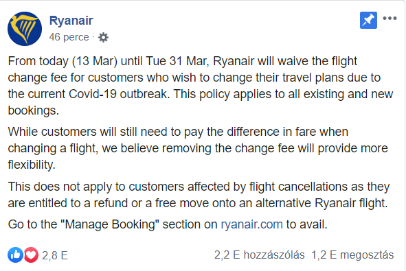 „Mától március 31-ig, a Ryanair lemond a járatmódosítás díjáról, ha valaki a koronavírus-járvány miatt szeretné megváltoztatni az utazási terveit. Az új szabályzat a már meglévő és új foglalásokra is vonatkozik. Azzal együtt, hogy a vásárlóknak ezután is ki kell fizetni repülőjegyek közti esetleges árkülönbséget, talán a járatmódosítási díj eltörlése könnyebbséget jelent” – írja a Ryanair hivatalos Facebook-oldala.