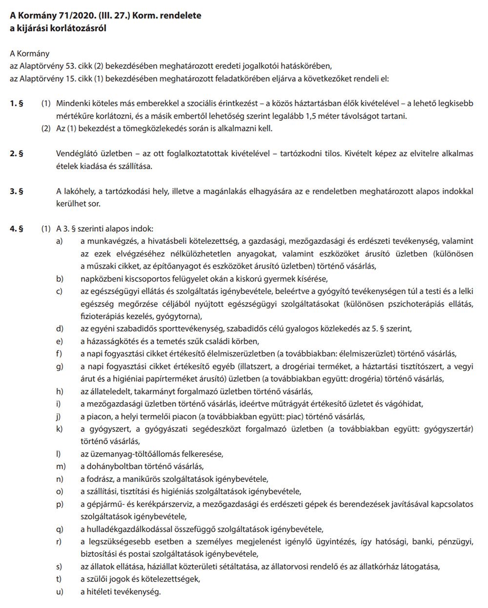 Kijárási korlátozás lép érvénybe az egész ország területén most szombattól, március 28-tól. Két hétig tart. Ezt Orbán Viktor miniszterelnök jelentette be, és már alá is írta az erről szóló rendeletet. A szöveget itt lehet elolvasni, igaz, péntek reggel – történetében alighanem először – elérhetetlen volt a Magyar Közlöny oldala. Sikerült letöltenünk, íme a rendelet: