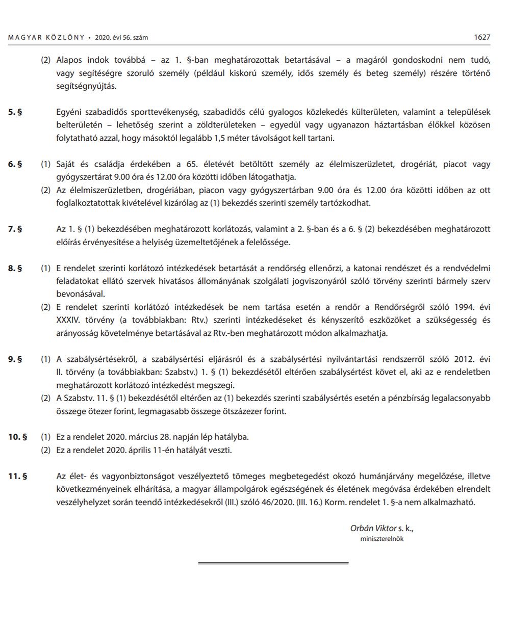 A miniszterelnök hangsúlyozta, hogy ez nem lakhelyelhagyási tilalom („amikor egy légy sem mehet ki”), hanem korlátozás, igaz, Európában az egyik legszigorúbb. A hatóságok büntethetnek is, akár ötvenezer forintra, de a cél nem a kikényszerítés, hanem hogy rávegyenek mindenkit az együttműködésre.