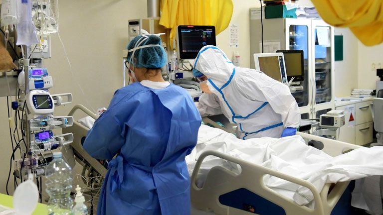 Koronavírussal fertőzött beteget ápolnak a milánói Vizzolo Predabissi kórház intenzív osztályán (Fotó: MTI/EPA-ANSA/Andrea Canali)