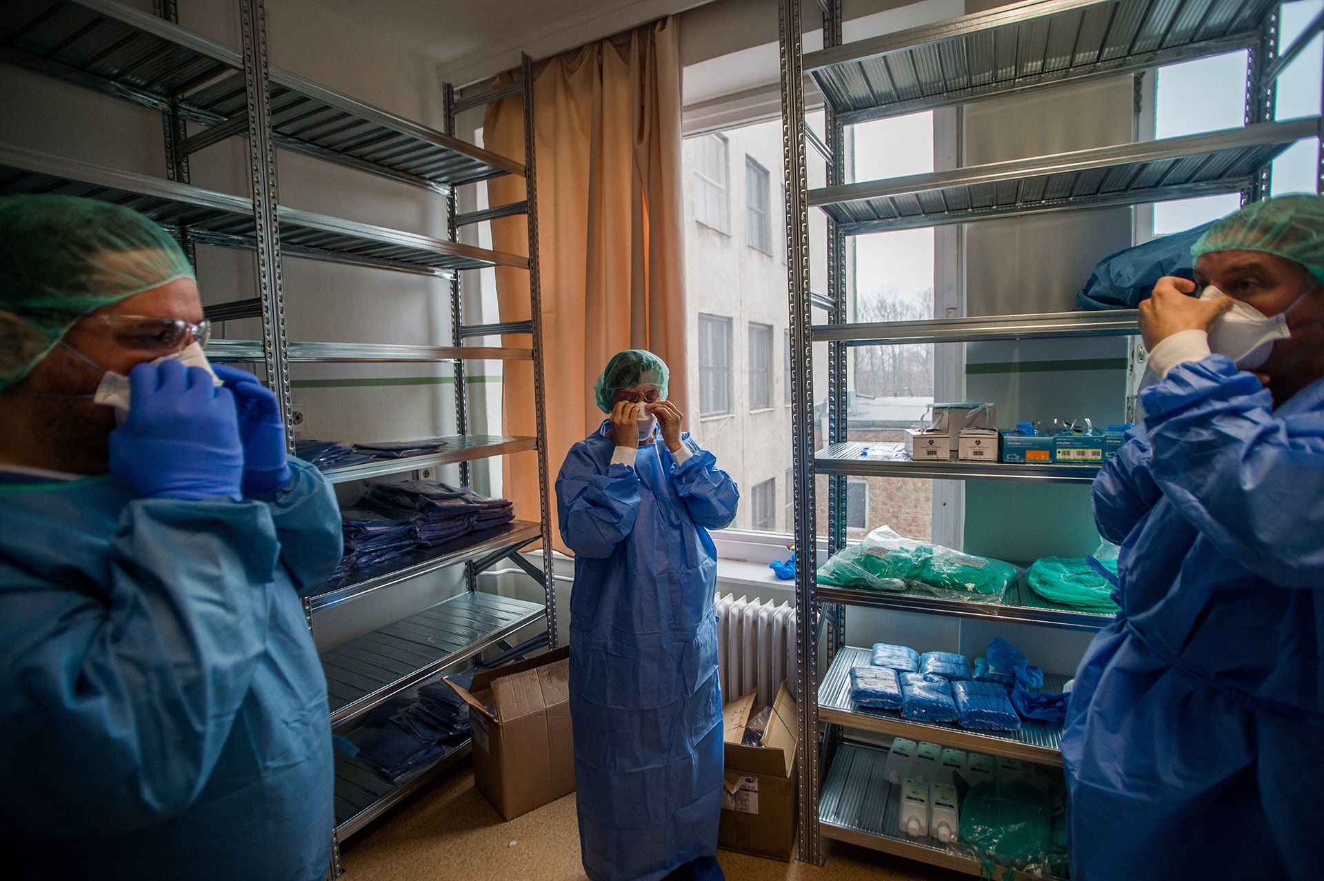 Orvosok védőfelszerelésben a koronavírussal fertőzött betegek fogadására kialakított részlegen az Országos Korányi Pulmonológiai Intézetben 2020. március 25-én.