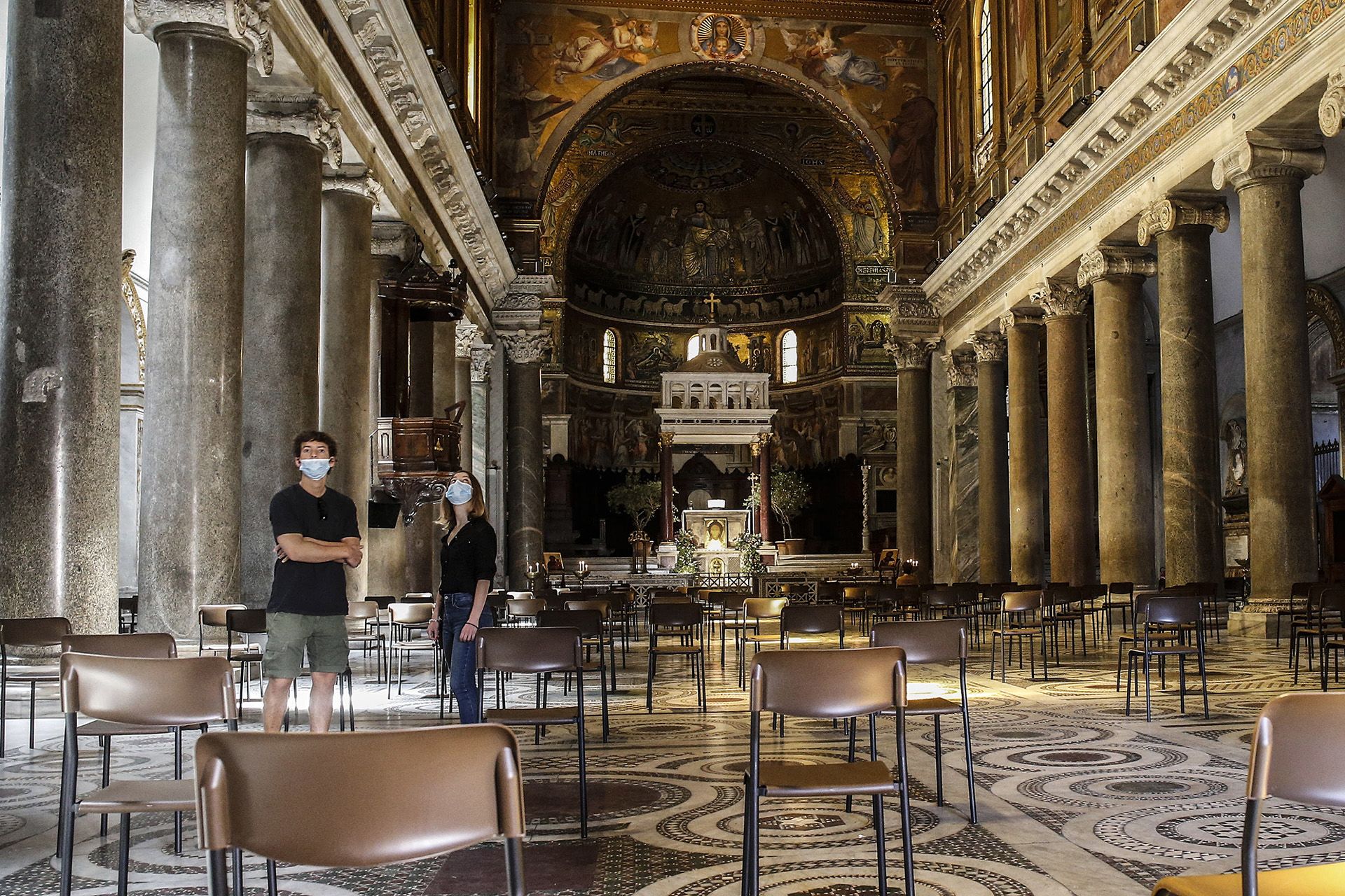 A padsorok helyett egymástól biztonságos távolságra elhelyezett székek a Tiberisen túli Szent Mária-bazilikában (Santa Maria in Trastevere) 2020. május 7-én, a koronavírus-járvány elleni védekezés második szakaszában (fotó: MTI/EPA-ANSA/Fabio Frustaci)