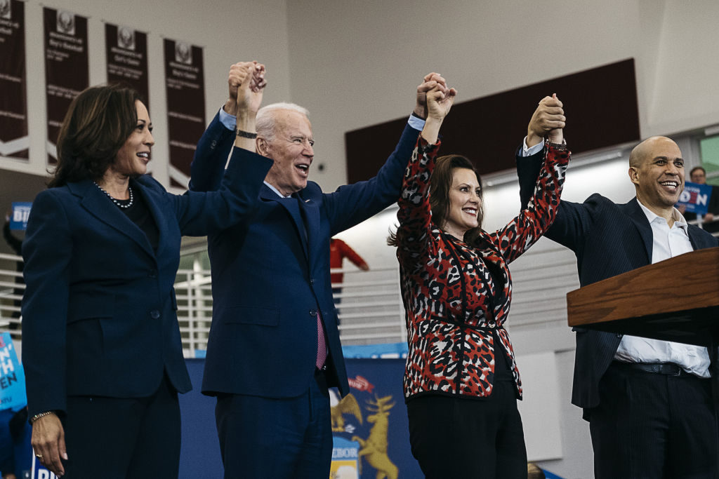 Kamala Harris, Kalifornia szenátora, Joe Biden, Gretchen Whitmer, Michigan kormányzója és Cory Booker a New Jersey-i demokratáktól, Biden kampányának detroiti állomásán (Fotó: Erin Kirkland/Bloomberg via Getty Images)