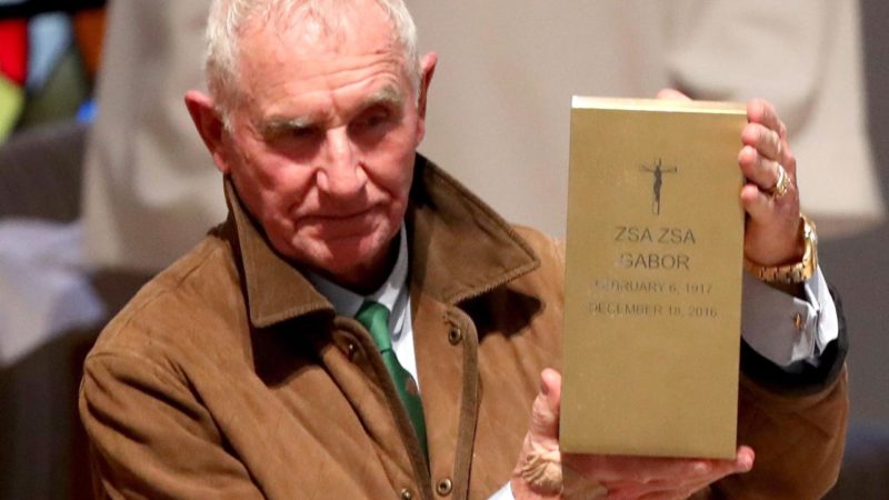 Frederic von Anhalt herceg, kezében a felesége, Gábor Zsazsa hamvait tartalmazó urnával a Beverly Hills-i Good Shepherd templomban tartott gyászszertartáson 2016. december 30-án – Fotó: MTI/EPA/Mike Nelson