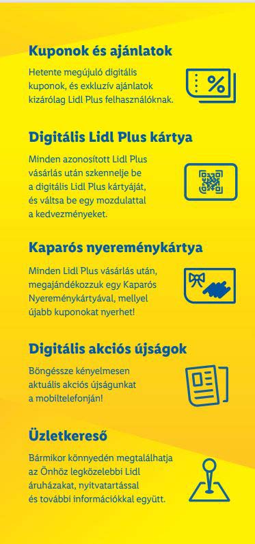 Az applikációban a heti akciós újságok mellett megtalálhatjuk a különféle kedvezményeket nyújtó kuponokat, a digitális nyugtánkat és a Lidl partnereinek kínálatát is. Az alkalmazás egy teljesen digitális hűségprogram egy virtuális hűségkártyával, amelyet, ha minden vásárlásnál használunk, rengeteget spórolhatunk. A Lidl Plus minden alkalommal kizárólagos kedvezményt nyújt azoknak a vásárlóknak, akik fizetéskor leolvassák a pénztárnál. Az akciós újságban szereplő kedvezményeken felül a Lidl Plus felhasználói hetente átlagosan 10-12 extra százalékos vagy fix összegű kuponnal spórolhatnak a bevásárlás során és minden vásárlást követően kaparós nyereménykártyát kapnak. A nyereménykártyával pedig még további nyereményeket lehet begyűjteni.