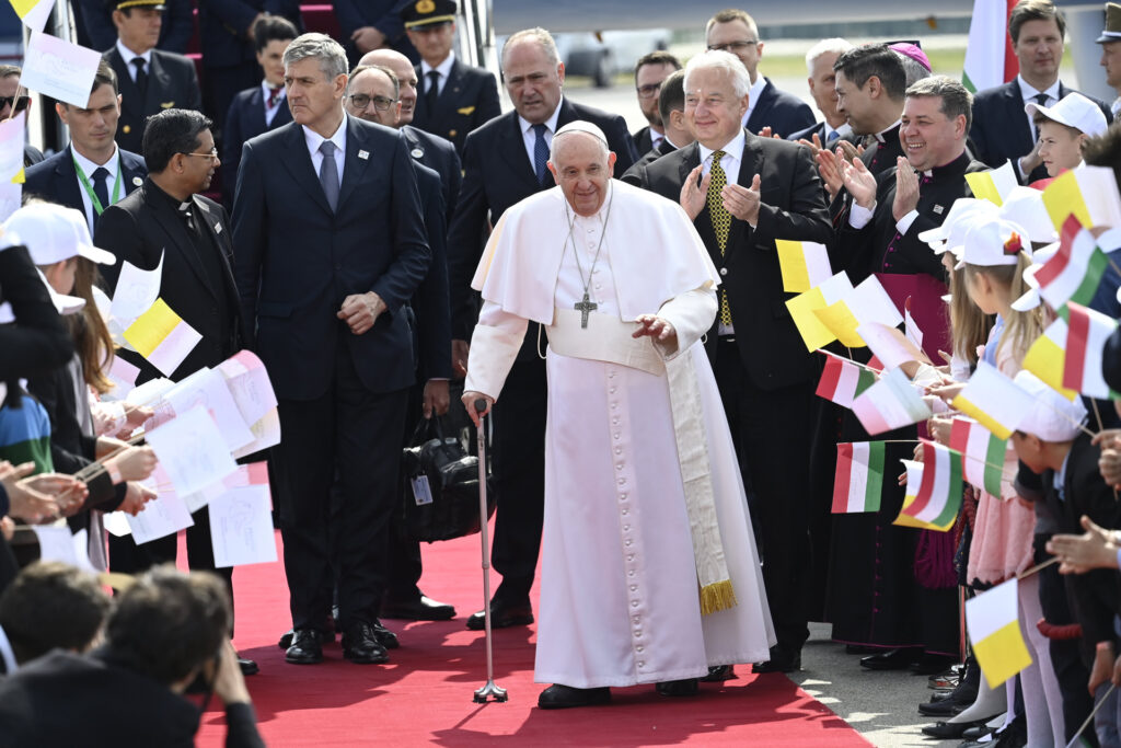 Ferenc pápa megérkezik a budapesti Liszt Ferenc-repülőtérre 2023. április 28-án (Fotó: MTI/Kovács Tamás)