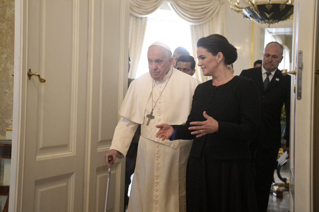 Novák Katalin köztársasági elnök fogadja Ferenc pápát a Sándor-palotában 2023. április 28-án (Fotó: