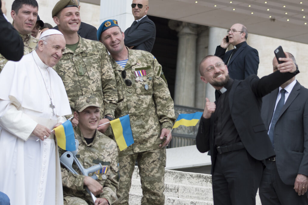 Ferenc pápa ukrán katonákkal pózol a Vatikánban, 2019-ben (Fotó: Massimo Valicchia/NurPhoto via Getty Images)