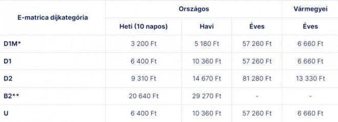 Ezek a díjak minden esetben bruttó díjak, tartalmazzák az áfát. A fenti díjtáblázat szerint D1-es kategóriában a 10 napos matrica 900 forinttal (6400 forint), a havi 1460 forinttal (10 360 forint), míg az éves matrica 8070 forinttal (57 260 forint) drágul. A D1-es megyei matrica ára 880 forinttal nő, így januártól 6600 forint lesz. Bár egy uniós előírás miatt jövő márciustól