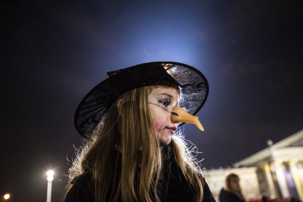 Boszorkány jelmezbe öltözött kislány a Töklámpás Fesztiválon, a Hősök terén (Fotó: MTI/Mónus Márton)