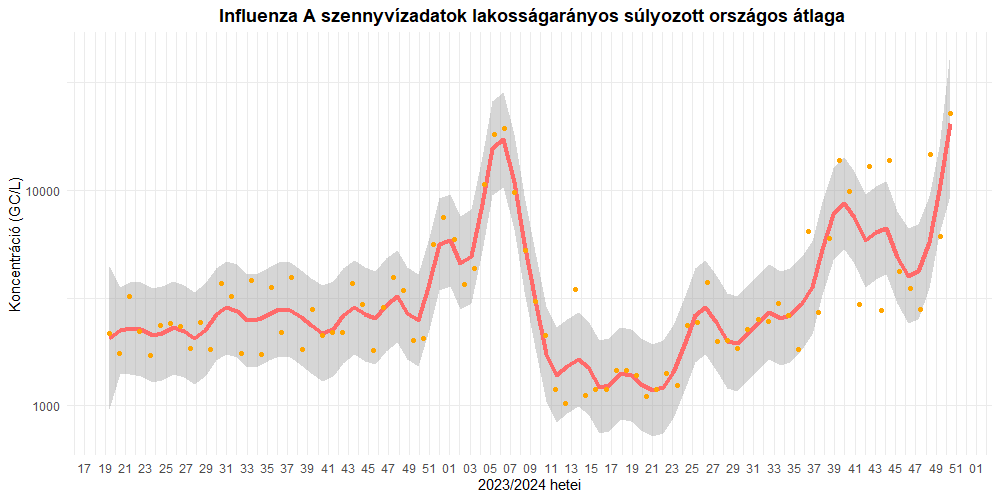 Az Influenza A örökítőanyag országos átlagkoncentrációja emelkedik; az 51. naptári héten Budapest Észak-pesti és Központi Szennyvíztisztító Telep ellátási területén, Budapest agglomerációs településeinek egyesített mintájában, valamint Békéscsaba, Debrecen, Győr, Kecskemét, Nyíregyháza, Pécs, Salgótarján, Tatabánya és Veszprém esetében volt kimutatási határ felett az Influenza A vírus örökítőanyagának mennyisége – olvasható a Nemzeti Népegészségügyi és Gyógyszerészeti Központ oldalán.