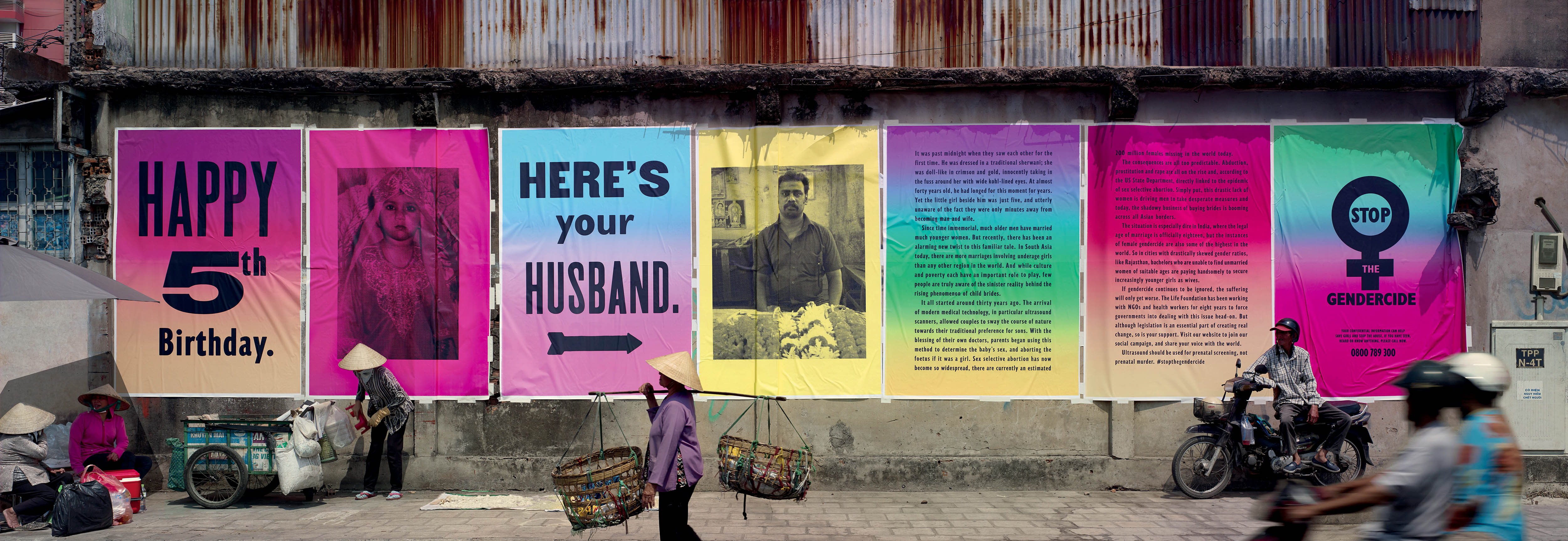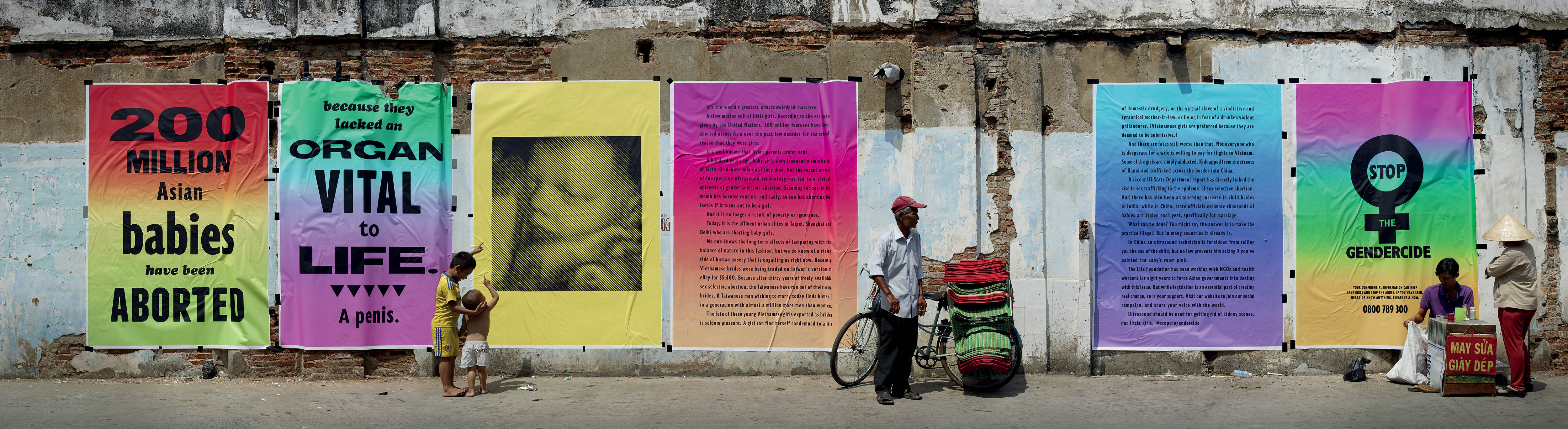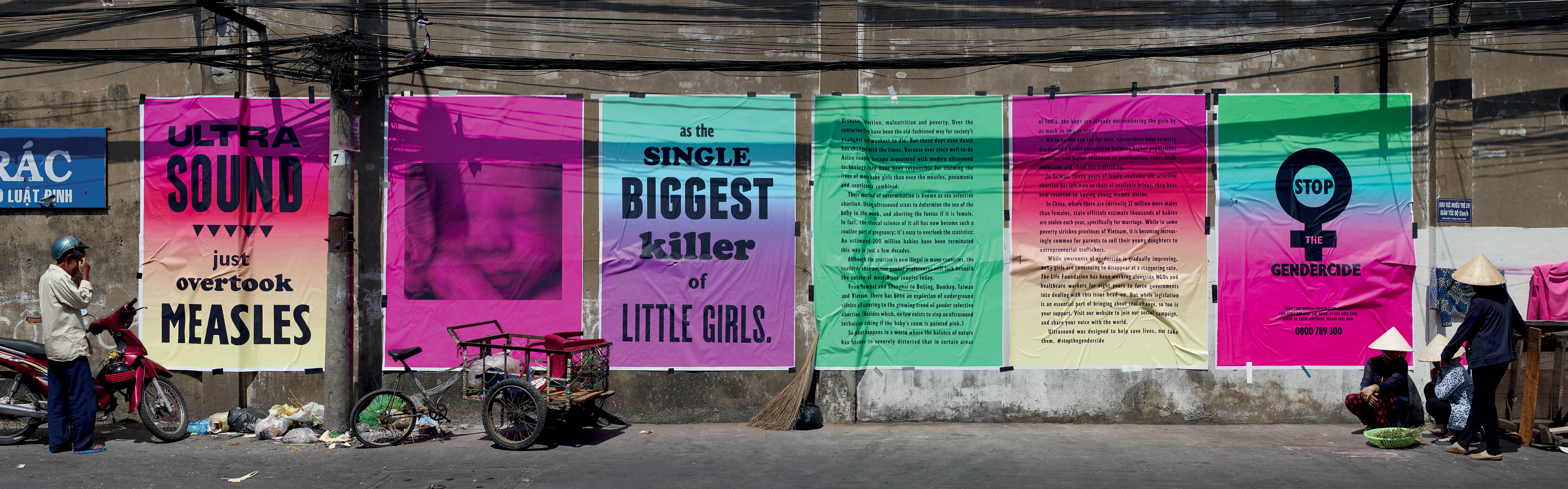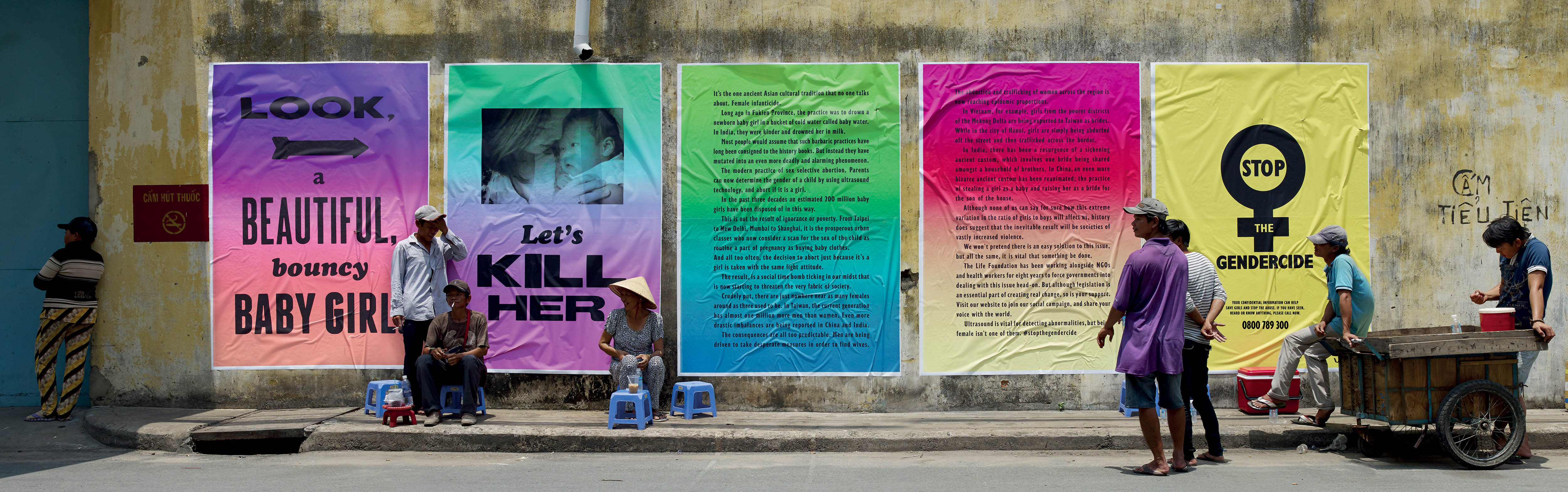 A The Life Foundation számára készültek a „Stop the Gendercide”-plakátok, amelyeken az újszülött kislány babák diszkriminációja elleni harc a cél: magzatok százmillióit vetetik el azért, mert nem hímnemű.