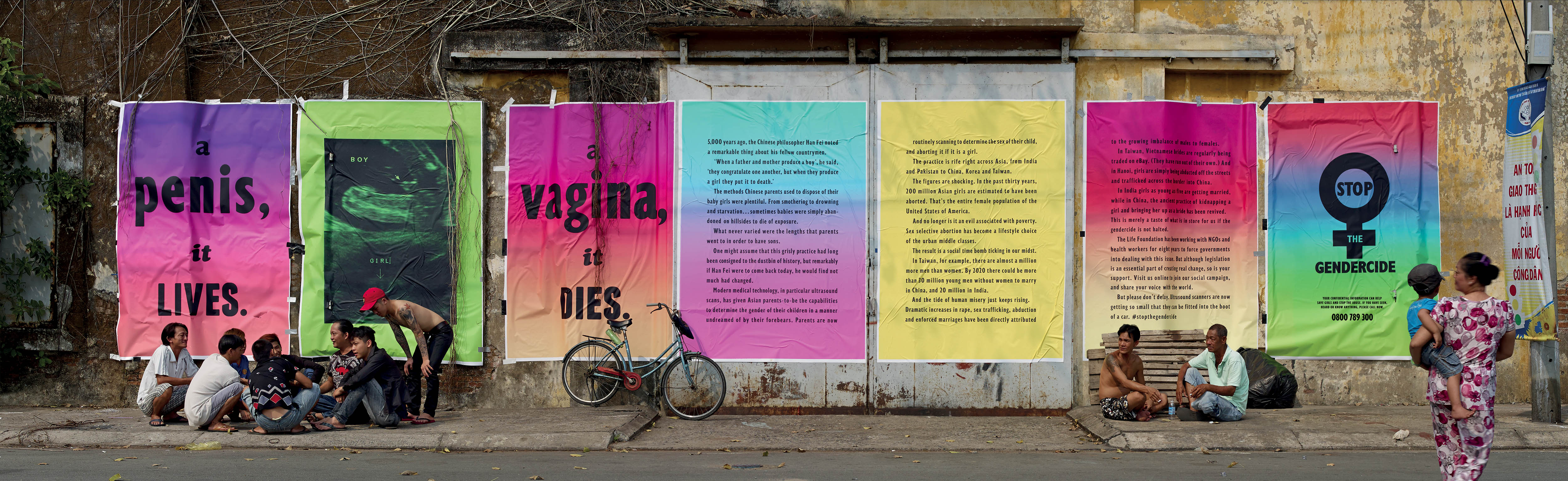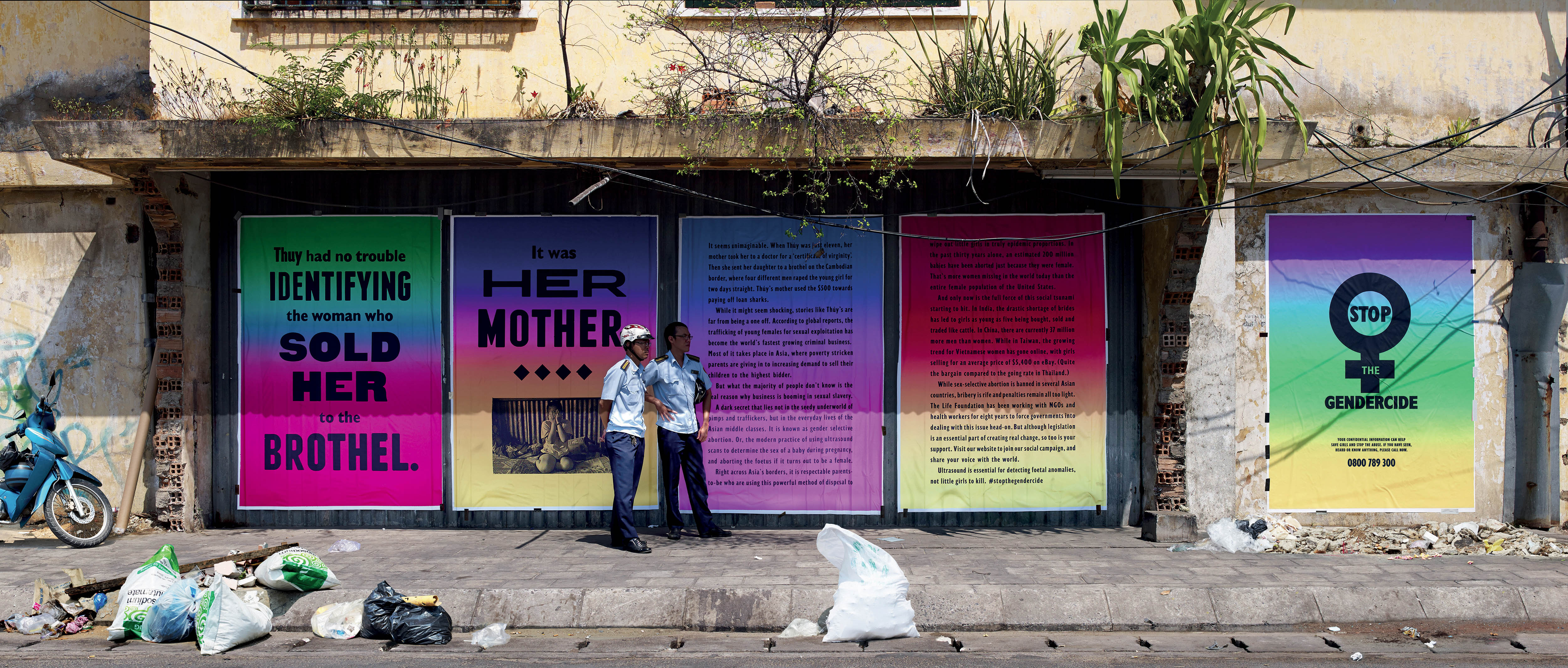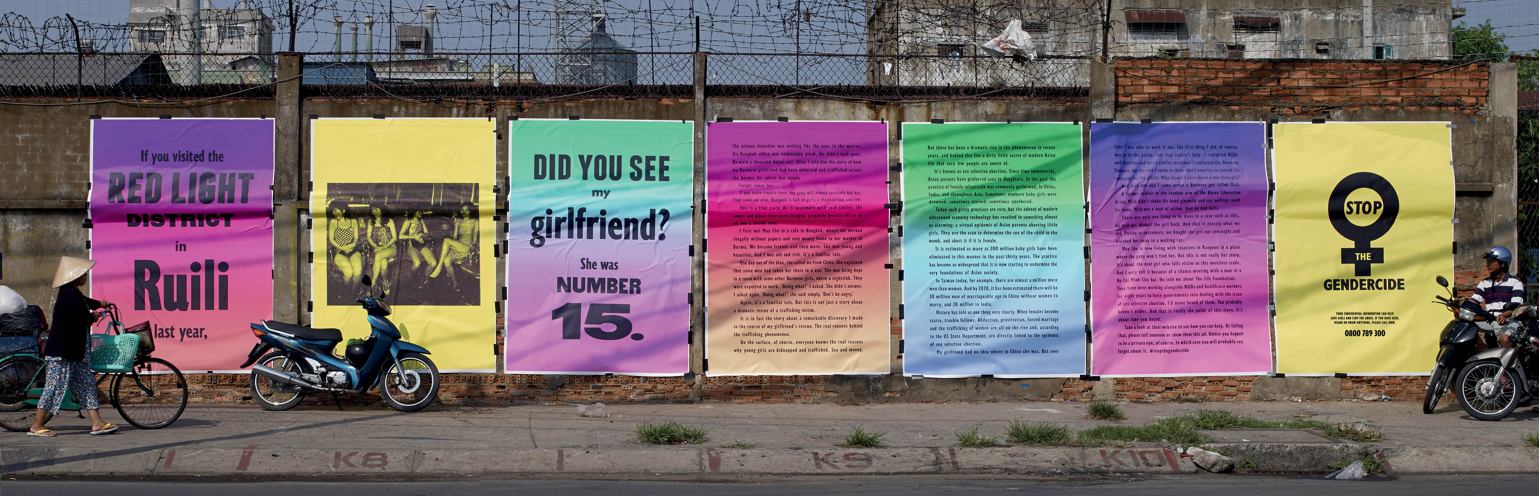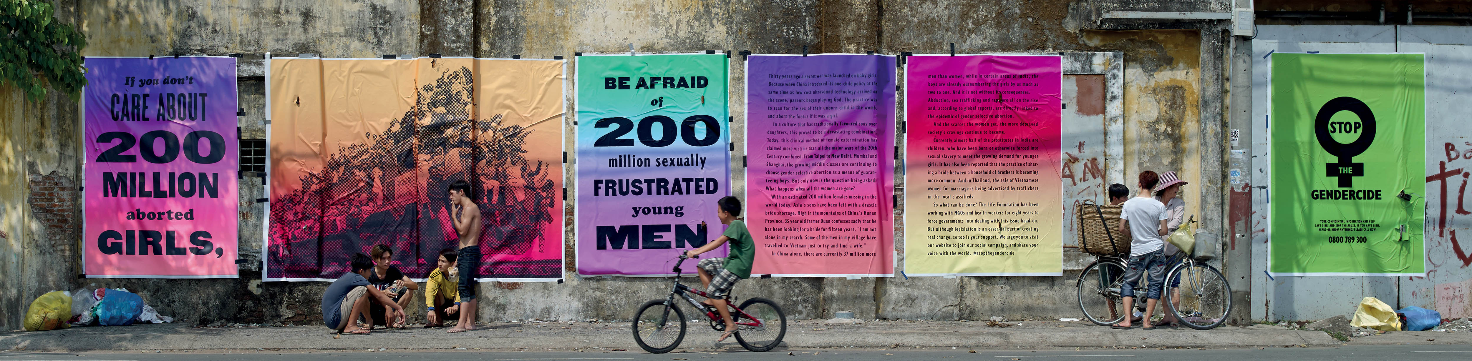 A The Life Foundation számára készültek a „Stop the Gendercide”-plakátok, amelyeken az újszülött kislány babák diszkriminációja elleni harc a cél: magzatok százmillióit vetetik el azért, mert nem hímnemű.