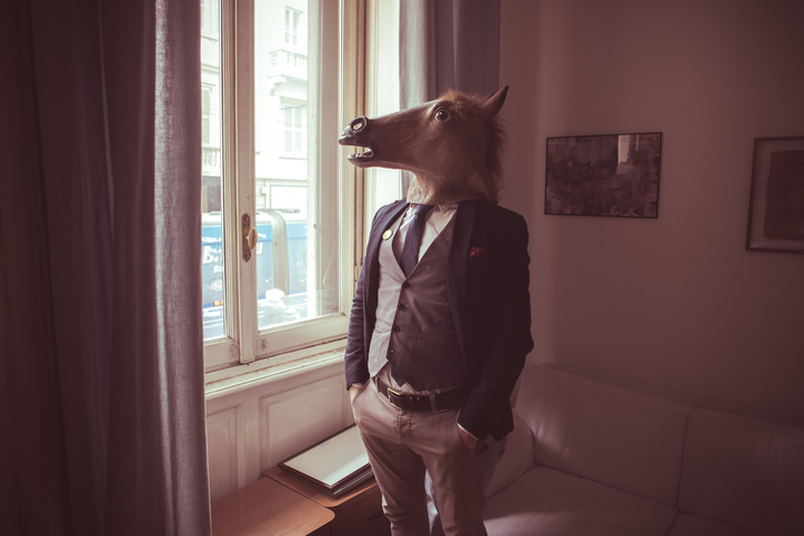 A lófejű ember, aki csodálkozva bámul ki az ablakon
